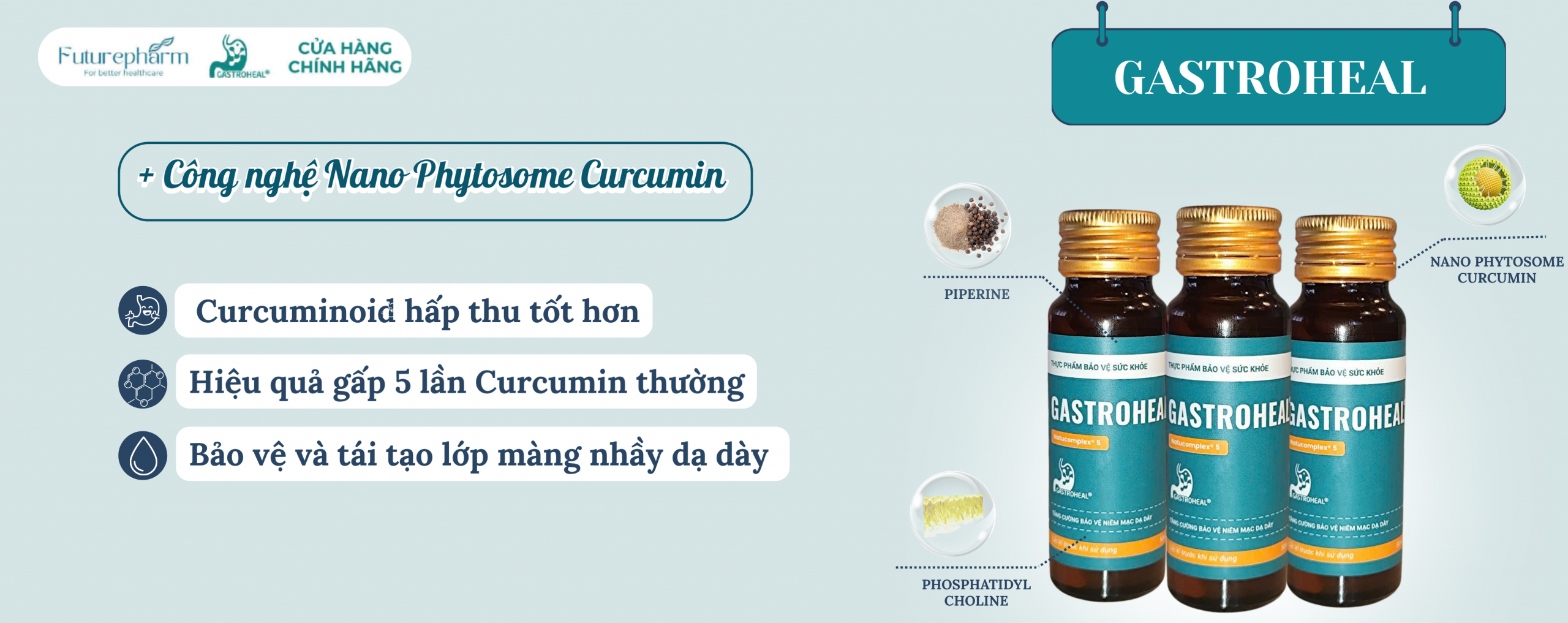 Công nghệ Nano Phytosome trong GASTROHEAL, Curcumin được bao bọc bởi một lớp phospholipid, tạo thành các hạt nano siêu nhỏ. Nhờ cấu trúc này, Curcumin có thể dễ dàng đi qua thành ruột và được hấp thu vào máu, giúp cơ thể tận dụng tối đa hoạt chất này. Điều này giúp tăng hiệu quả chống viêm và làm lành niêm mạc dạ dày lên nhiều lần so với Curcumin thông thường.